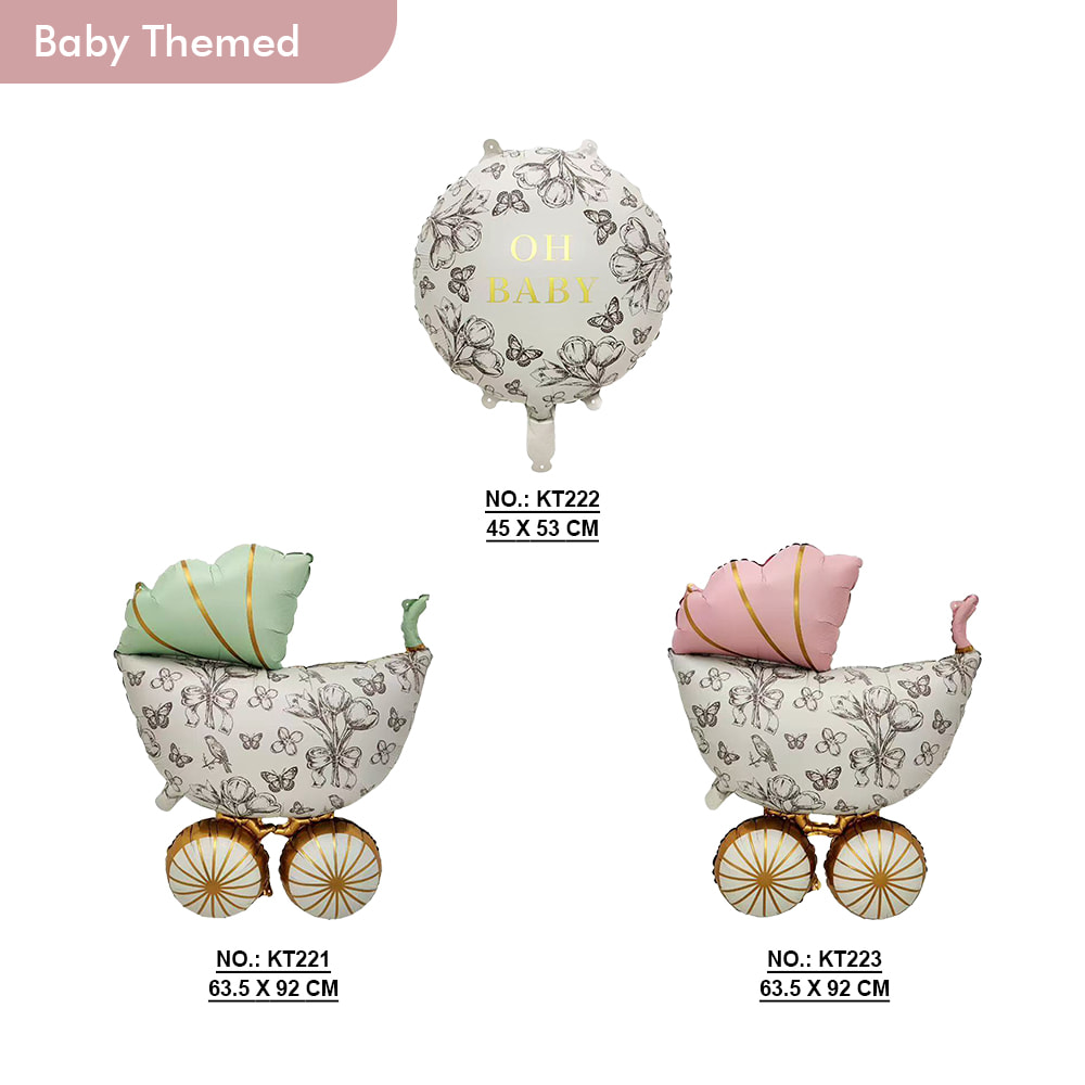 Available in three designs: round “OH BABY” balloon, mint baby carriage, and pink baby carriage